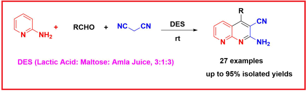 The use of deep eutectic solvents (DESs) not only promotes the reaction but also aligns with green chemistry principles due to their biodegradability, low toxicity, cost-effectiveness, and recyclability. A green and efficient one-pot, three-component synthesis of 2-amino-4-phenyl-1,8-naphthyridine-3-carbonitrile derivatives has been developed using lactic acid-based DESs. The reaction, involving 2-aminopyridine, aromatic aldehydes, and malononitrile, proceeds under mild conditions in a DES composed of lactic Acid, maltose, and amla (Indian gooseberry) Juice (3:1:3 molar ratio) without the need for any additional catalysts or additives. Among various DESs evaluated, this ternary mixture exhibited the highest catalytic activity, delivering products in good to excellent yields. The methodology offers notable advantages, including high atom economy, reduced reaction time, and elimination of hazardous solvents. The synthesized naphthyridine derivatives were structurally confirmed by FTIR, NMR, and HRMS analyses. This study highlights the potential of natural-product-based DESs as sustainable media for multicomponent heterocycle synthesis, with significant implications for the field of organic synthesis and green chemistry