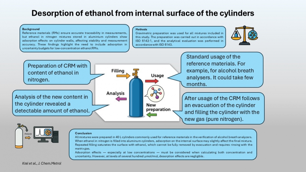 Reference materials (RMs) are essential for ensuring metrological traceability in various fields, including environmental monitoring, chemical analysis, and the verification of alcohol breath analyzers. One critical property of RMs is their long-term stability, particularly for gas mixtures such as ethanol in nitrogen, which are stored in pressurized aluminum cylinders. This paper describes the preparation of such gas mixtures according to ISO 6142-1, utilizing differential weighing to minimize the influence of ambient conditions and ensure accurate composition. The effects of adsorption of ethanol on the internal surfaces of aluminum cylinders were experimentally investigated. Results indicate that ethanol can remain adsorbed on the cylinder walls even after evacuation, leading to measurable ethanol concentrations upon subsequent refilling with nitrogen. Repeated fillings demonstrated a decrease in ethanol levels, confirming the saturation and gradual desorption behavior. These findings underscore the necessity to consider adsorption effects in the uncertainty budget and composition calculations for low-concentration ethanol-in-nitrogen RMs.