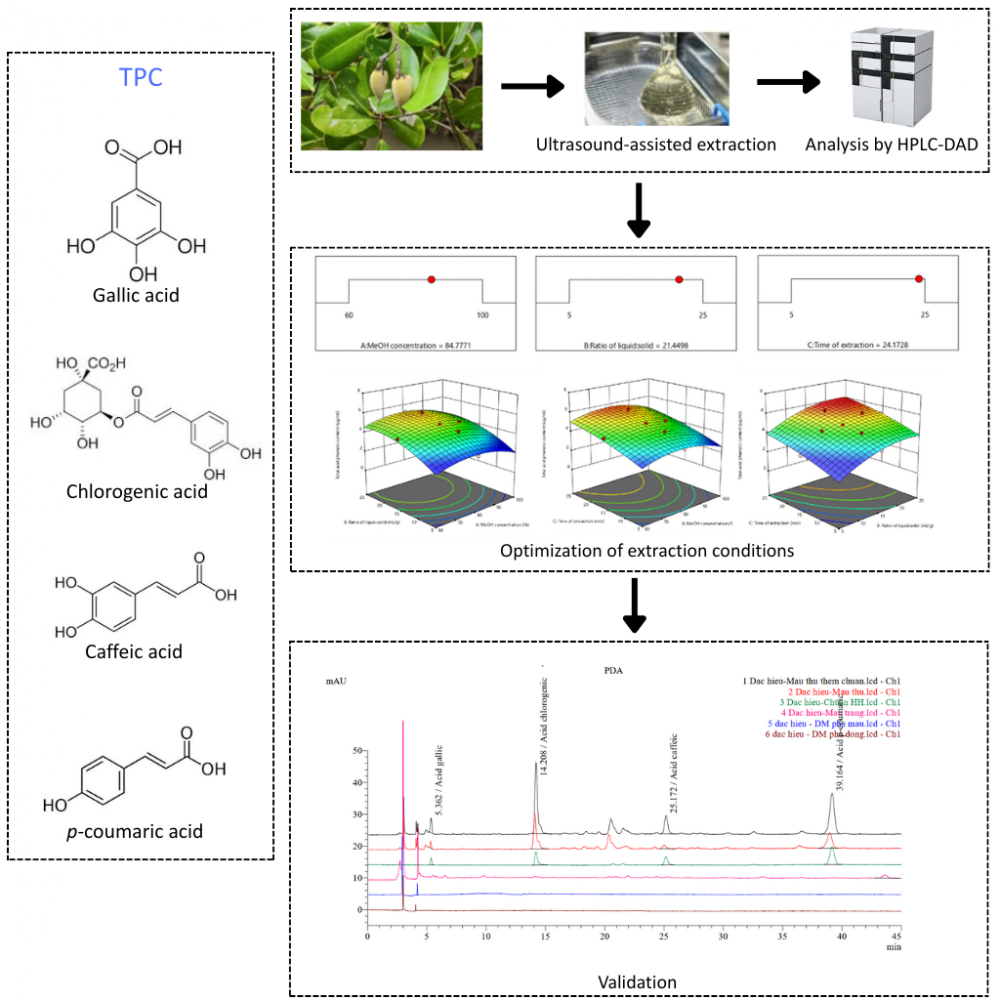 Avicennia officinalis L. is a valuable mangrove species rich in phenolic compounds with antioxidant, anti-inflammatory, and antimicrobial properties. Despite this, research on extracting these compounds from its fruit is limited. This study focused on developing and optimizing an ultrasound-assisted extraction (UAE) method to quantify four specific phenolic acids (gallic, chlorogenic, caffeic, and p-coumaric acids) from A. officinalis fruit collected in Ca Mau, Vietnam. The optimized UAE conditions by response surface methodology (RSM) involved methanol concentration of 84.78%, the liquid-to-solid ratio at 21.45 mL/g and extraction time at 24.17 minutes, and three extraction cycles. The method was validated according to AOAC guidelines, demonstrating excellent linearity, precision (RSD <11%), and accuracy (recovery rates 82.68-104.51%). This research marks the first successful quantification of these phenolic acids in A. officinalis fruit in eight location of Ca Mau province, Vietnam, offering a highly efficient (>99%) and repeatable (RSD <6%) method for future studies.