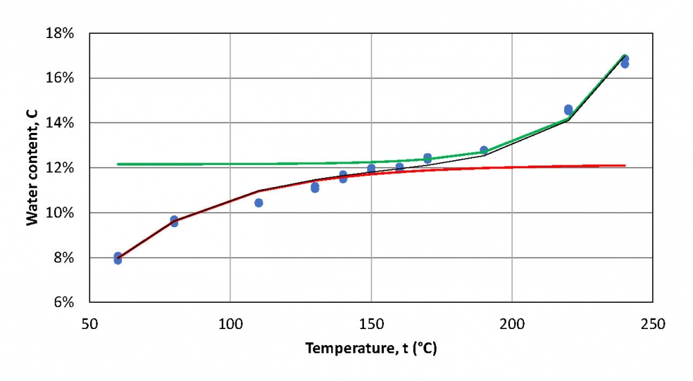 Accurate determination of the water content in plant-derived materials is both crucial and challenging. Most plant-derived materials are not soluble, making conventional coulometric Karl Fischer (KF) titration methods unsuitable for the purpose. The vaporisation–coulometric KF titration (vap-C-KFT) technique offers a more effective alternative for such samples. However, identifying the optimal heating temperature for vaporisation is challenging because at a certain temperature, some components of the material can decompose, while the water released from other components can still be insufficient. In this study, we propose an approach to determine the optimal oven temperature at which insufficient release of water is compensated by the water released due to decomposition, using the vap-C-KFT method. The experimental water content values, depending on KF oven temperature, are approximated by a so-called “sigmoid curve” model that is defined by 5 parameters. This enables to find the optimal analysis temperatures and water content values for different plant-derived materials. The model worked well for barley seeds, wheat seeds, and different types of lignin. However, for crushed rapeseeds the experimental data did not follow the same model, and for non-crushed rapeseeds the water content uncertainty was significantly higher than for other materials.