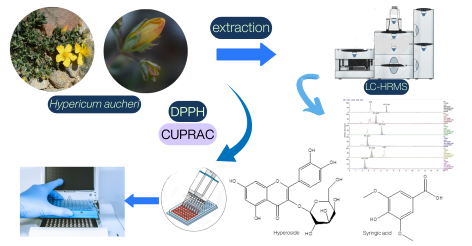 The study aims to identify the secondary metabolites of Hypericum aucheri Jaub. & Spach extracts using liquid chromatography-high resolution mass spectrometry (LC-HRMS) and to evaluate the plant's antioxidant activity. Antioxidant activity was assessed using DPPH free radical scavenging and CUPRAC assays. The primary secondary metabolite detected was hyperoside, with concentrations of 1059.53 mg/L in acetone (Ac) extract and 389.73 mg/L in methanol (MeOH) extract. Sinapinic acid was the predominant compound in the chloroform (C) extract, with a concentration of 6646.53 mg/L. In addition, Ac extract showed the highest DPPH free radical scavenging activity (85.90±0.26 - 61.19±0.47%) of all the extracts tested. The MeOH extract exhibited the highest value in the CUPRAC assay (2.53±0.05 mmol TR g-1). The study highlights a numerical relationship between phenolic content and antioxidant activity, underscoring the importance of phenolics in their antioxidant functions.