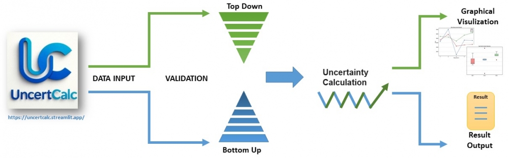 This study presents UncertCalc, a web-based tool developed to facilitate measurement uncertainty calculations in laboratory settings. The application is supporting both Top-Down and Bottom-Up approaches. The Top-Down module performs ANOVA based estimation of within day repeatability and between day intermediate precision using multi day repeated measurements. The Bottom-Up module calculates the combined measurement uncertainty by incorporating user-defined uncertainty components. Both modules have graphical visualization of uncertainty contributions. The computational accuracy of UncertCalc was independently validated using Microsoft Excel and R, using randomly generated representative data for both Top-Down and Bottom-Up approaches. Results from these comparisons proved to be in perfect agreement across the different platforms, confirming that UncertCalc offers statistically reliable and fully traceable calculations, consistent with established analytical tools.