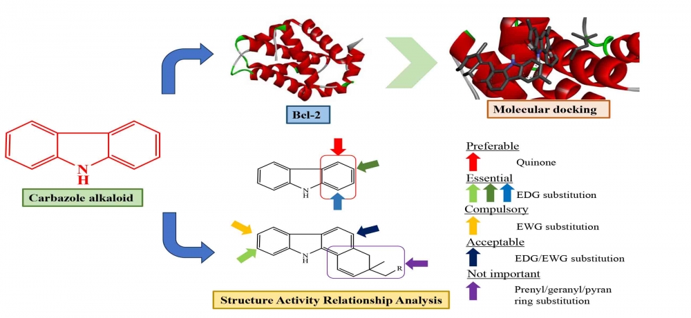 Carbazole alkaloids from Murraya koenigii exhibit diverse structural features and promising anticancer potential. This study evaluated the cytotoxic activity and structure–activity relationship (SAR) of 24 carbazole alkaloids against HL-60 and HeLa cancer celllines, alongside molecular docking studies against the anti-apoptotic protein Bcl-2 (PDB ID: 2W3L).The SAR analysis revealed that electron-donating and redox-active substituents, particularly formyl groups, significantly enhanced cytotoxicity, while dimerization generally reduced potency. Docking results showed binding energies ranging from −5.49 to −9.37 kcal/mol, with key interactions mainly involving Phe63, Asp70, Phe71, Met74, Val92,Glu95, Leu96, Asp99, Gly104, Phe109, Glu111 and Phe112 residues. Potent compounds such as mahanine (15) and murrayamine-J (18) exhibited both strong cytotoxicity (IC50 = 12.1 and 5.1 μg/mL for HL-60 and 12.8 and 7.7 μg/mL for HeLa, respectively) and favorable binding affinities (−7.66 and −7.25 kcal/mol), suggesting that Bcl-2 inhibition contributes to their activity. Conversely, murrayafolline-A (2) displayed notable cytotoxicity (IC50 = 8.5 μg/mL forHL-60 and 4.6 μg/mL forHeLa) despite only moderate predicted affinity (−5.71 kcal/mol), indicating possible alternative mechanisms of action. Similarly, bisisomahanine (24) showed the strongest predicted binding (−9.37 kcal/mol) with lowest ligand efficiency but negligible cytotoxicity, suggesting that the high binding affinity is attributed to its bulky size. Overall, this study provides supportive computational insights into the cytotoxic potential of carbazole alkaloids and highlights their predictive relevance for future mechanistic and pharmacokinetic studies.