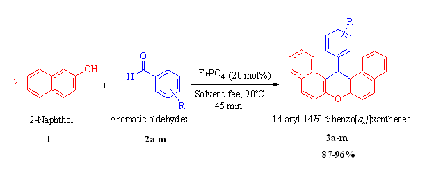 A simple and efficient method has been developed for the synthesis of xanthene derivatives using various aromatic aldehydes and 2-naphthol under solvent-free conditions. In this procedure, ferric phosphate (FePO4) is used as an efficient and reusable heterogeneous Lewis acid catalyst for the synthesis of various derivatives of 14-aryl-14H-dibenzo[a,j]xanthene (3a-3m) in excellent yields (87-96%). The present method affords notable advantages such as short reaction time, simple workup procedure, reusability of the catalyst and high conversions of the products. All products have been confirmed by their melting points and spectroscopic techniques such as 1H NMR, 13C NMR, IR spectroscopy and mass spectrometry.