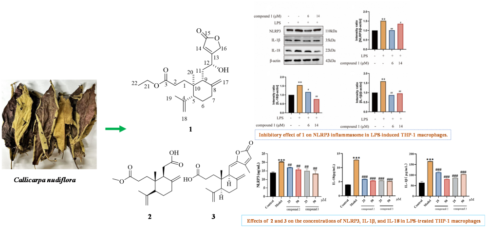 A previously uncharacterized 3,4-seco-labdane diterpenoid, which is designated Callinudin A (1), along with two known diterpenoids of the same type (2, 3), was isolated from Callicarpa nudiflora leaves. Multiple spectroscopic techniques and literature comparisons were used to elucidate the structures of these compounds. Furthermore, these compounds were tested in vitro to assess their effects on the NLRP3 inflammasome in lipopolysaccharide (LPS)-induced THP-1 macrophages. Analysis revealed that these compounds exhibit inhibitory effects on the NLRP3 inflammasome.