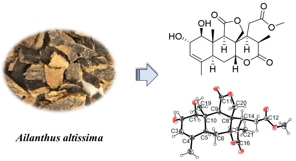 A new quassinoid, named vilmorinine G (1), along with two known congeners (2 and 3), has been isolated from the root bark of Ailanthus altissima (Mill.) Swingle. The structure of 1 was elucidated through spectroscopic evidence in NMR, HR-ESI-MS, and ECD. The absolute configuration of 1 was further confirmed by X-ray crystallography.