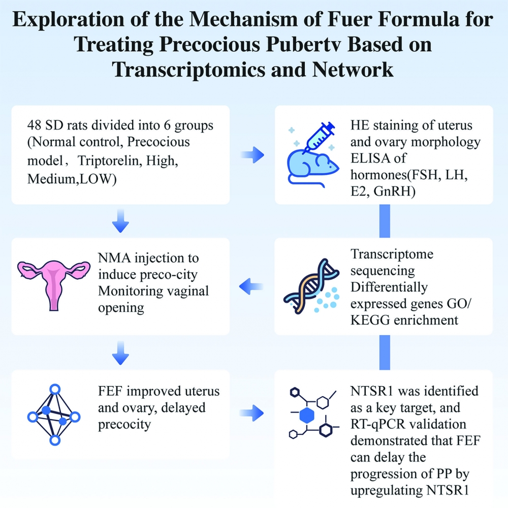 This study investigated the therapeutic mechanism of Fuer Decoction against precocious puberty through transcriptomics and network pharmacology. Female SD rats were allocated to six groups, and an NMA-induced model was established before drug administration. Vaginal opening, estrous cycle, reproductive organ morphology, and serum LH, FSH, E2, and GnRH levels were evaluated. Transcriptome sequencing, differential gene analysis, PPI network construction, GO/KEGG enrichment, and molecular docking were conducted, and NTSR1 was validated via RT-qPCR. UHPLC-MS analysis identified 603 potential active compounds in the decoction. Fuer Decoction alleviated pathological changes and hormonal dysregulation in model rats. NTSR1 emerged as a core target, mainly associated with neuroactive ligand–receptor interactions and calcium signaling pathways.Eicosapentaenoic acid and aurantiamide acetate showed strong binding affinities to NTSR1. These findings suggest that Fuer Decoction may exert therapeutic effects on precocious puberty by modulating these pathways and key genes.