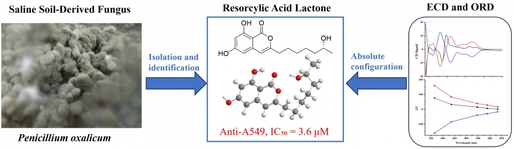 A chemical analysis of Penicillium oxalicum, a fungus isolated from saline soil, resulted in the discovery of four bioactive compounds (1–4), including a new resorcylic acid lactone, named penioxalone A (1). The structural characterization of penioxalone A was achieved through comprehensive spectroscopic techniques, including 1D and 2D NMR spectroscopy, coupled with HRESIMS data. To determine its absolute configuration, experimental data from ECD and ORD were compared with theoretical calculations. The cytotoxicity of compounds 1, 3, and 4 was assessed against A549 human lung carcinoma cells, revealing IC₅₀ values of 3.6, 0.23, and 0.35 μM, respectively. These compounds exhibited enhanced potency compared to cisplatin, a standard chemotherapy drug, which had an IC₅₀ of 4.2 μM.