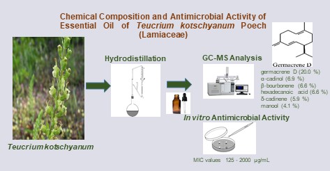 The genus Teucrium L., a member of the Lamiaceae family, is represented by approximately 36 species in Türkiye. In this study, the essential oil composition of the aerial parts of Teucrium kotschyanum Poech collected from ˙Izmir (Ödemi¸s) was investigated by gas chromatography (GC) and gas chromatography-mass spectrometry (GC-MS) for the first time. The major compounds were identified as germacrene D (20.0%), α-cadinol (6.9%), β-bourbonene (6.6%), hexadecanoic acid (6.6%), δ-cadinene (5.9%) and manool (4.1%). The antibacterial and antifungal activities of the essential oil were evaluated against six bacteria and six fungi using the microdilution broth method. The essential oil exhibited limited antimicrobial activity, with the highest efficacy observed against Candida utilis (MIC:125 μg/mL) and the lowest against Staphylococcus epidermidis and Salmonella typhimurium (MIC: 2000 μg/mL).