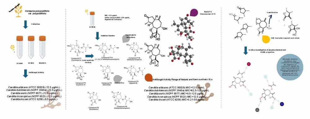 The emergence of multidrug-resistant Candida strains especially, Candida auris, C. dubliniensis, and C. inconspicua has accelerated the research on antifungal novel molecules. Sesquiterpene lactones, abundant in the Asteraceae family, have drawn attention with their antifungal activity. Therefore, three extracts obtained from the aerial part of Turkish endemic Centaurea polypodiifolia were investigated against Candida albicans (ATCC 90028), C. krusei (ATCC 6258), C. dubliniensis (NCPF 3949a), C. inconspicua (NCPF 8523), and C. auris (NCPF 8977) and gave MIC values between 6.25 and 12.5 µg/mL. Dichloromethane (DCM-M) extract yielded five known (cynaropicrin, cynarinin A, aguerin B, grosheimin, and dehydrocynaropicrin) and one novel (nourolide) guaianolide-type sesquiterpene lactones. Two semi-synthetic cynaropicrin derivatives were obtained to enhance the molecular diversity of the present study. 1D (1H and 13C APT) and 2D (COSY, HSQC, HMBC, and NOESY) NMR experiments were employed for structure elucidation. MIC values of the tested sesquiterpene lactones against the above-mentioned strains ranged between 3.12 and 50 µg/mL. Molecular dynamics simulations were conducted to investigate the interaction of 4 (aguerin B), which demonstrated the highest antifungal activity, with the exo-β-(1,3)-glucanase and 14-α-demethylase enzymes. These findings revealed stable binding interactions, suggesting that aguerin B has potential as a lead for further antifungal drug development.