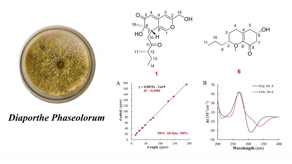 Eight compounds were isolated from the ethyl acetate extract of the Diaporthe phaseolorum fermentation products, comprising five polyketide derivatives (1–5), one chromene (6), one chromone (7), and one tetralone (8). Among these, compounds 1 and 6 were identified as previously undescribed. Notably, compound 6 features a unique C12 chromone skeleton, representing only the second reported example of such a framework. The structures and spatial configurations of all compounds were elucidated through comprehensive analysis of HR-MS, NMR, and quantum chemical calculations supported by DP4+ analysis. In vitro anti-inflammatory activity screening revealed that none of the isolated compounds (1–8) inhibited nitric oxide (NO) production in mononuclear macrophages.