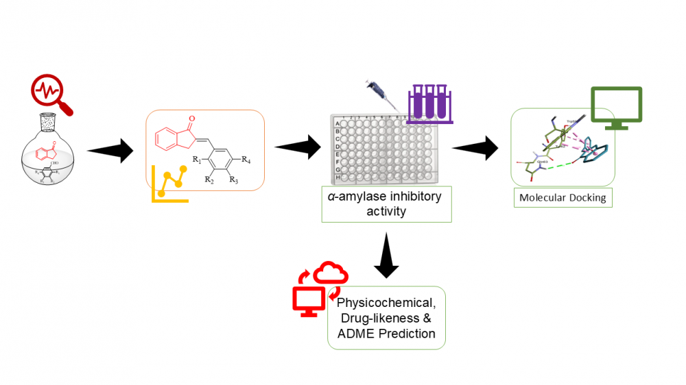 In search for novel antidiabetic agents, a new series of substituted 2-benzylidene-1-indanone derivatives were synthesized via crossed Adol condensation reaction. The structures of the synthesized compounds were determined using various spectroscopic techniques, including HREIMS, FTIR, and NMR. The enzyme inhibitory activities of the target analogues were assessed using in vitro assays. The tested compounds demonstrated inhibitory potential against α-amylase, as indicated by their IC50 values ranging from 17.7 to 28.2 µM as compared to standard drug acarbose with IC50 value of 30.2 ± 1.9 µM. Furthermore, molecular docking study was conducted to elucidate the binding interactions of the compounds within the α-amylase enzyme binding pocket (PDB ID 2QV4). The results of molecular docking studies indicated that compounds 3m, 3c, 3d has the lowest binding energy (-9.8, -9.3 and -9.4, respectively). The structure-activity relationship (SAR) analysis revealed that alteration in the inhibitory activities of α-amylase enzymes was provided by distinct types of substituents attached to either ortho- or para positions of the phenyl group. The combined SAR and docking results highlight the importance of para-position substitution on ring A for optimal activity, particularly when introducing moderately electron-withdrawing groups such as chlorine, fluorine, and bromine. Thus, in the pursuit of developing newer antidiabetic agents, the in silico ADME prediction was carried out with promising physicochemical, drug likeness and ADME properties which indicated that some compounds were considered drug-like as they do not violate any of the rule-based filters of Lipinski.