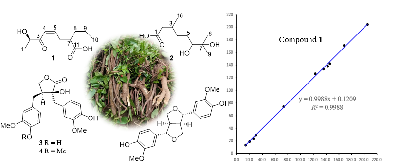 A phytochemical investigation of the roots of the medicinal plant Wikstroemia indica (Linn.) C. A. Mey led to the isolation of five compounds (1–5), comprising one previously undescribed metabolite (1), named windienoic acid, and four reported compounds (2–5). The structural elucidation of these compounds was accomplished through comprehensive analysis of spectroscopic data, including 1D (¹H and ¹³C NMR) and 2D NMR techniques (HSQC, COSY, and HMBC). Compounds 2–5 were identified as the monoterpene 6,7-dihydroxy-3,7-dimethyl-2-octenoic acid (2), the dibenzylbutyrolactone-type lignans (-)-nortrachelogenin (3) and (-)-trachelogenin (4), and the furofuran-type lignan pinoresinol (5) by comparing with literature data. Notably, the structure of compound 1 incorporated an extended conjugated system comprising a dienone moiety linked to a carboxylic acid group, which is rarely in acyclic compound, its structure was confirmed by 13C NMR calculation. The NMR assignment of dihydroxy-3,7-dimethyl-2-octenoic acid (2) is reported herein for the first time in methanol-d4. The cytotoxic screening assay against the A549 human lung cancer cell line of all compounds revealed that compound 3 exhibited weak activity with an IC₅₀ value of 42.3 μM.