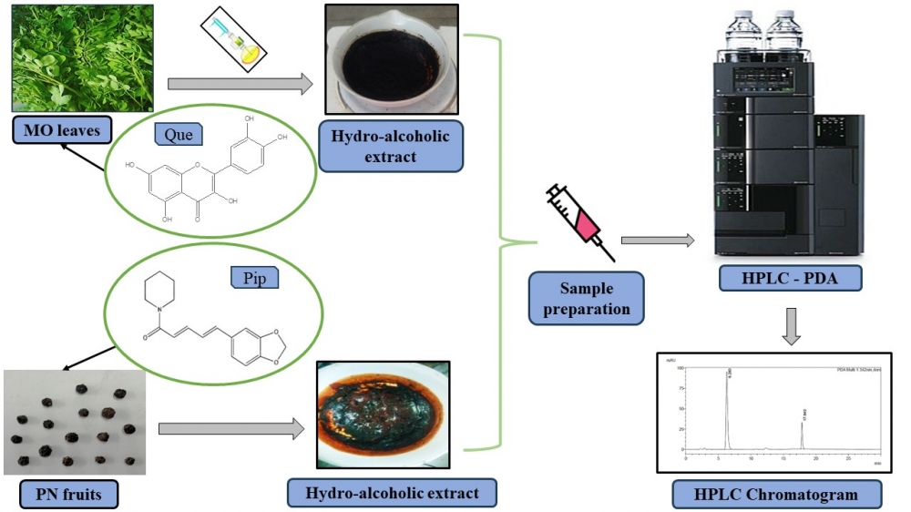 A simple, effective, and fast reversed-phase high-performance liquid chromatographic method was devised to separate and quantitatively determine quercetin and piperine in herbal extract. the analytes were eluted on the Intersil C18 ODS column (150 mm×4.6 mm, 5μm) as a stationary phase with a gradient elution technique. The mobile phase was composed of a mixture of water (with 0.1% formic acid) and methanol (with 0.1% formic acid) and the gradient program of 30 minutes was optimized. The mobile phase flow rate was adjusted to 1 mL min-1 for 20 μL injection volume. The eluents were detected by the PDA detector at 342 nm wavelength. At the optimized chromatographic conditions, the developed method was validated for the parameters including system suitability, specificity, linearity, accuracy, precision, and robustness per the ICH Q2(R1) guidelines. The developed method was applied for the determination of quercetin and piperine in the prepared herbal extract.