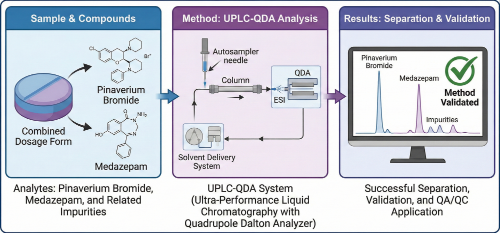A rapid ultra-performance liquid chromatographic method coupled with a quadrupole detector (UPLC–QDA) was developed and validated for the simultaneous determination of pinaverium bromide, medazepam, and their related substances in a newly developed fixed-dose pharmaceutical formulation. Chromatographic separation was achieved on an Acquity BEH C18 column (100 × 2.1 mm, 1.7 µm) using a gradient elution of 25 mM ammonium formate buffer (pH 3.5) and acetonitrile at a flow rate of 0.6 mL/min and a column temperature of 45 °C. The total run time was 11 min, providing complete resolution of all analytes without interference. Linearity was demonstrated (R² ≥ 0.999) within the ranges of 2–400 ng/mL for medazepam, 10–2000 ng/mL for pinaverium bromide, 5–1000 ng/mL for RS1 (medazepam impurity), and 10–2000 ng/mL for RS3–RS6 (pinaverium bromide impurities). The limits of detection (LOD) and quantitation (LOQ) were 0.17 and 0.50 ng/mL for medazepam and 0.43 and 1.30 ng/mL for pinaverium bromide, respectively, while LOD and LOQ values for related substances ranged between 0.22–0.91 ng/mL and 0.66–2.70 ng/mL. The method was validated in accordance with the ICH Q2(R2) guideline. The validated method was successfully applied for the simultaneous quantification of pinaverium bromide, medazepam, and their respective impurities (RS1–RS6) in commercial film-coated tablets (50 mg/10 mg), demonstrating its applicability for routine quality control and stability testing of fixed-dose combination formulations.