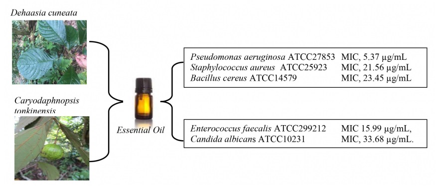 The herbs, Dehaasia cuneata (Blume) Blume and Caryodaphnopsis tonkinensis (Lecomte) Airy-Shaw (Lauraceae) were used ethnomedically for the treatment of malaria, inflammation and amelioration of microbial infections. We report herein the chemical constituents and antimicrobial activity of the leaf essential oils of D. cuneata and C. tonkinensis from Vietnam. The technique of gas chromatography (GC) and gas chromatography coupled with mass spectrometry (GC/MS) was used to analyze the oil samples while the microdilution assay was employed to determine the antimicrobial efficacy. The main constituents of D. cuneata were α-pinene (49.0%), camphene (19.5%), β-pinene (15.6%) and limonene (7.5%), while α-pinene (26.8%), β-pinene (23.0%) and bicyclogermacrene (8.5%). The leaf oil of D. cuneata displayed potent antimicrobial activity against Gram-negative bacteria, Pseudomonas aeruginosa ATCC27853 with minimum inhibitory concentration (MIC) value of 5.37 µg/mL; and Gram-positive microorganisms of Staphylococcus aureus ATCC25923 (MIC, 21.56 µg/mL and Bacillus cereus ATCC14579 (MIC, 23.45 µg/mL). The leaf oil of C. tonkinensis exhibited good antibacterial activity towards Enterococcus faecalis ATCC299212 with MIC value of 15.99 µg/mL, and anti-candidal action against Candida albicans ATCC10231 with MIC value of 33.68 µg/mL. the chemical constituents and antimicrobial activity of the essential oils were being reported for the first time.