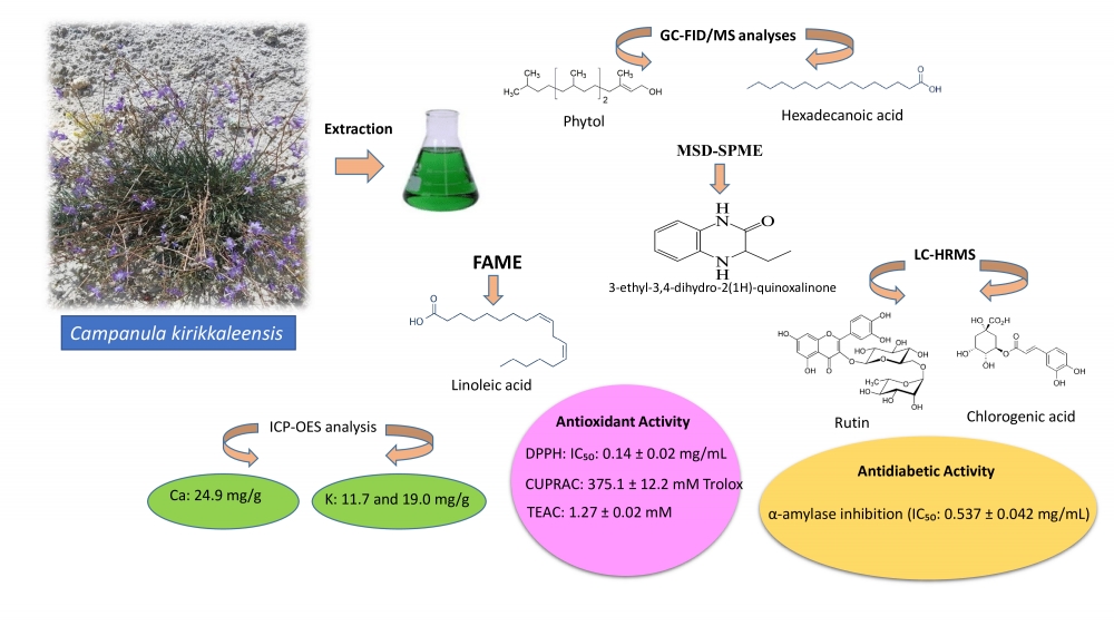 This study presents the first comprehensive evaluation of the phytochemical profile and cell-free antioxidant and enzyme inhibitory activities of the endemic Campanula kirikkaleensis Dönmez & Güner. n-Hexane, chloroform, and 70% methanol extracts from aerial parts and roots were investigated for their phytochemical composition and bioactivities. GC-FID/MS analyses revealed phytol (14.2%) as the main volatile in aerial parts and hexadecanoic acid (22.5%) in roots. MSD-SPME identified 3-ethyl-3,4-dihydro-2(1H)-quinoxalinone as the major shared volatile (9.8% in aerial parts; 14.5% in roots). Linoleic acid was the predominant fatty acid in both parts (26.4% in aerial parts; 22.3% in roots). LC-HRMS highlighted rutin (525.29 mg/100g dry plant) in aerial parts and chlorogenic acid (24.78 mg/100g dry plant) in roots as dominant phenolics. The 70% methanol aerial extract showed the strongest antioxidant activity (DPPH IC₅₀: 0.14 ± 0.02 mg/mL; CUPRAC: 375.1 ± 12.2 mM Trolox), while the highest TEAC value was recorded in the chloroform root extract (1.27 ± 0.02 mM). The same methanol extract also demonstrated the most potent α-amylase inhibition (IC₅₀: 0.537 ± 0.042 mg/mL). ICP-OES analysis revealed calcium as most abundant in aerial parts (24.9 mg/g) and potassium in roots and flowers (11.7 and 19.0 mg/g). These findings provide a detailed chemical and bioactivity profile of C. kirikkaleensis, supporting its potential for future pharmacological investigations.