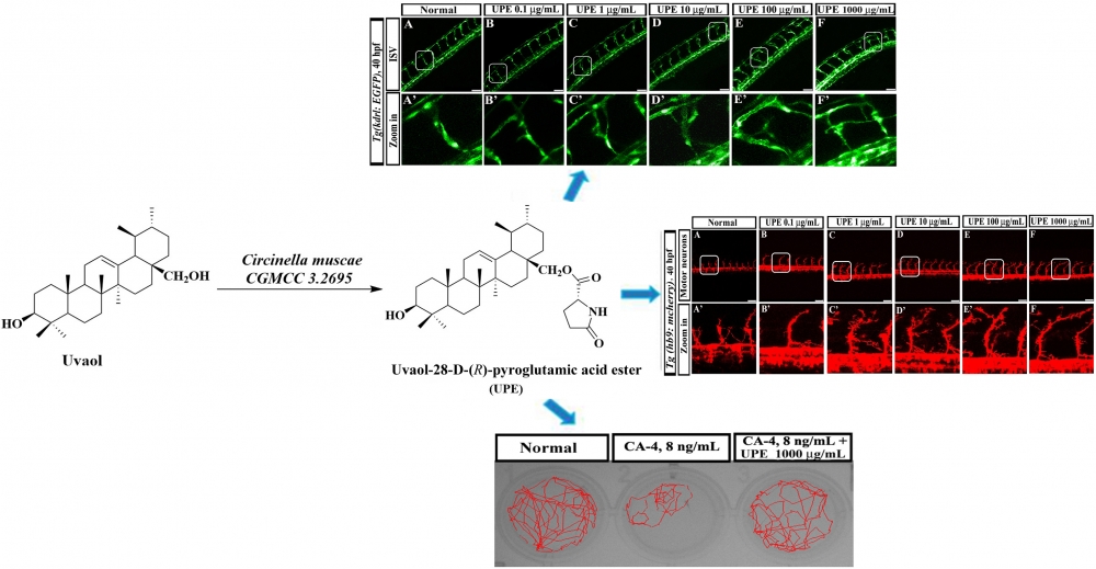 A novel triterpenoid compound named Uvaol-28-D-(R)-pyroglutamic acid ester (UPE) was obtained via microbial biotransformation of uvaol by Circinella muscae CGMCC 3.2695. Its structure was elucidated by spectroscopic and mass-spectrometric analyses, including 1D-, 2D-NMR and HR-ESI-MS. UPE administration promotes intersegmental vessel (ISV) growth and motor neuron development in transgenic zebrafish embryos in a concentration-dependent manner. Furthermore, UPE significantly restored the swimming distance in zebrafish exposed to combretastatin A-4 (CA-4), as assessed by ESOvision behavioral analysis. These findings suggest that UPE holds promise for the treatment of cardiovascular and cerebrovascular diseases.